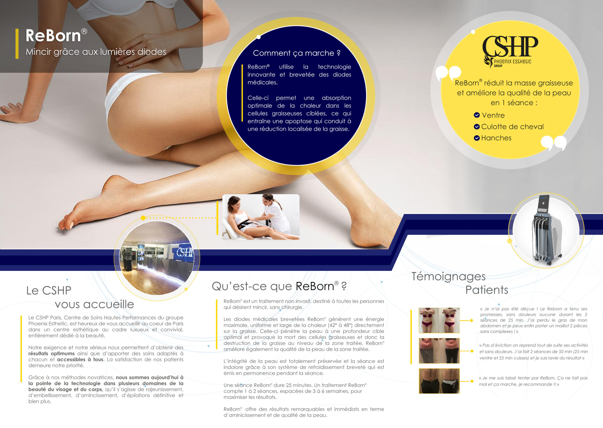ReBorn est une nouvelle méthode révolutionnaire qui permet de faire fondre les cellules graisseuses par la chaleur émise par ses applicateurs à une température de 42° à 47°. Cette technique remodèle efficacement votre silhouette et vous fera perdre une à deux tailles en l'espace d'une heure seulement.